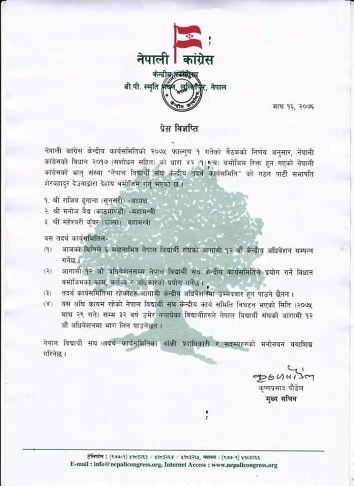तदर्थ समितिलाई ६ महिनाभित्र नेविसंघको १२ औं महाधिवेशन गर्ने जिम्मेवारी तोकिएको छ ।