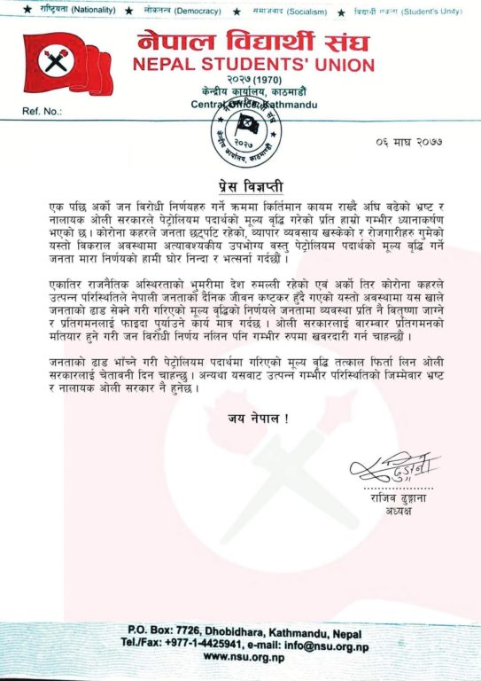 नेविसंघ अध्यक्ष राजिव ढुंगानाले जारी विज्ञप्तिमा भनेका छन्, ‘जनताको ढाड भाँच्ने गरी पेट्रोलियम पदार्थमा गरिएको मूल्यवृद्धि तत्काल फिर्ता लिन ओली सरकारलाई चेतावनी दिन चाहन्छु । अन्यथा उसबाट उत्पन्न गम्भीर परिस्थितीको जिम्मेवार भ्रष्ट र नालायक ओली सरकार नै हुनेछ ।’