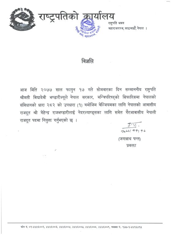 ‘राष्ट्रपति भण्डारीले मन्त्रीपरिषदको निर्णयबमोजिम नेपालको संविधानको धारा २८२ बमोजिम बेल्जियमका राजदूत गेहेन्द्र राजभण्डारीलाई नेदरल्याण्डका लागि समेत राजदूत पदमा नियुक्त गर्नुभएको छ,’ राष्ट्रपति कार्यालयद्धारा जारी विज्ञप्तिमा भनिएको छ ।