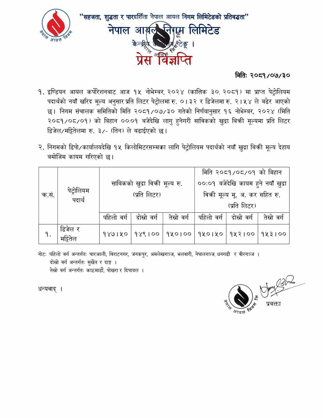 भारतबाट पेट्रोलमा प्रतिलिटर ०.३२ र डिजेल/मट्टितेलमा २.५४ रुपैयाँले बढेर आएपछि निगमको शुक्रबार बसेको सञ्चालक समितिको बैठकले डिजेल,मट्टितेलमा प्रतिलिटर ३ रुपैयाँले मूल्य वृद्धि गर्ने निर्णय गरेको निगमले जनाएको छ ।