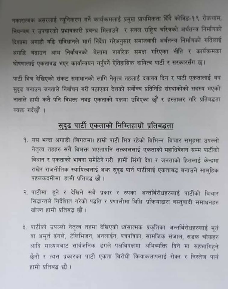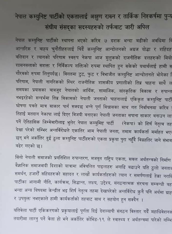 आइतबार सिंहदरबारमा आयोजित पत्रकार सम्मेलनमा नेकपाका ७० जना नेताहरुले पार्टी एकता संकटमा परेको भन्दै जनमतको कदर गर्न आग्रह गरेका छन् ।