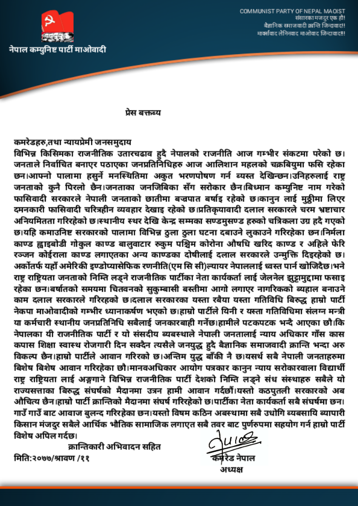 ‘हाम्रो पार्टीले यस्ता गतिविधिमा संलग्न मन्त्री या कर्मचारी जनप्रतिनिधिलाई जनकारबाही गर्नेछ । अन्तिम युद्ध बाँकी नै छ, यसर्थ सबै नेपाली जनतामा विशेष विशेष आह्वान गरिरहेका छौं,’ अध्यक्ष कमरेड नेपाल’द्धारा हस्ताक्षरित विज्ञप्तिमा उल्लेख ।