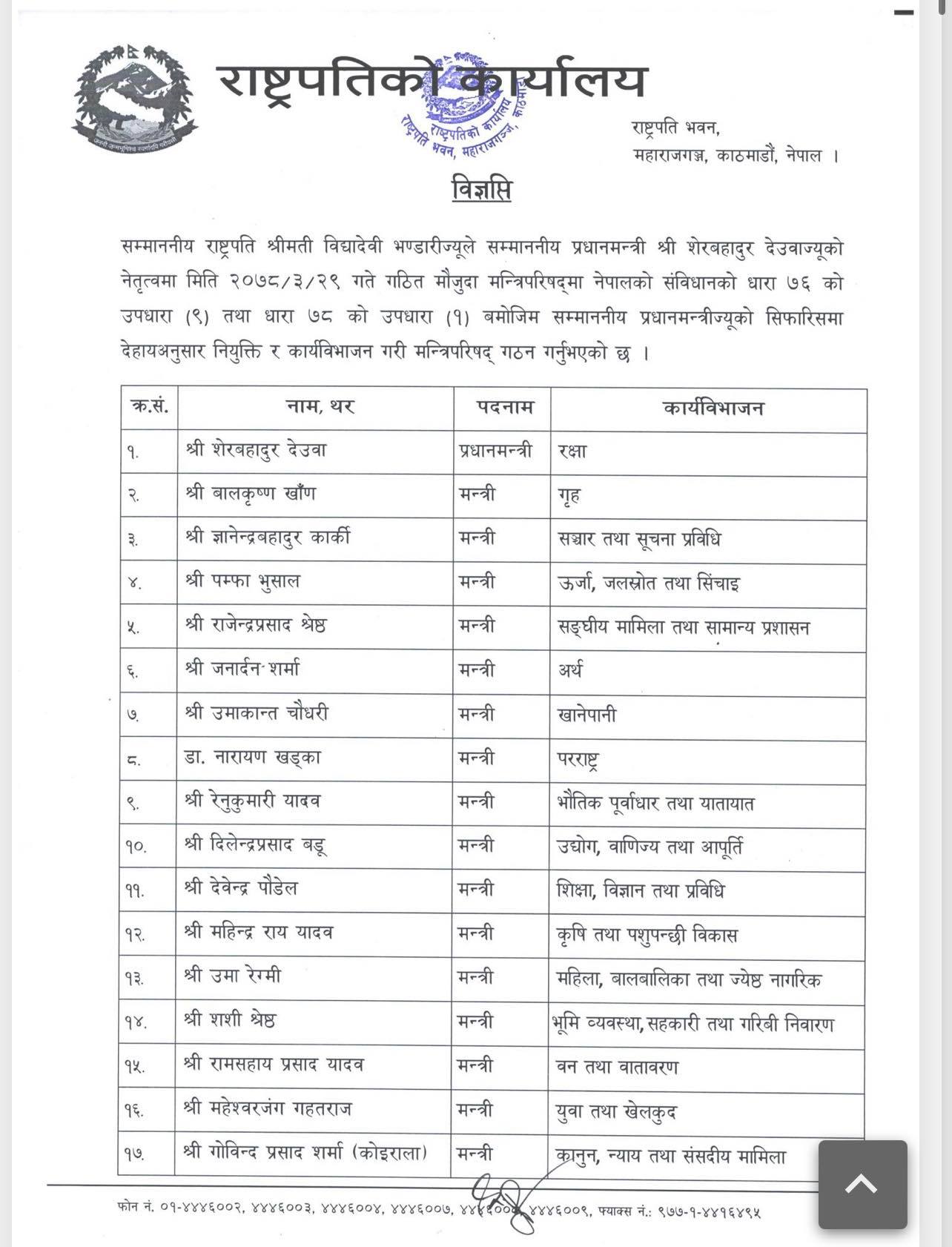 नेकपा एकीकृत समाजवादी पार्टीको सिफारिस बमोजिम प्रधानमन्त्री देउवाले आइतबार नेकपा एसका चार मन्त्री र एक राज्यमन्त्री परिवर्तन गरेका हुन् । राष्ट्रपति कार्यालयले विज्ञप्ति जारी गरेर अनुसार चार जना मन्त्री र एक राज्यमन्त्री परिवर्तन भएको जानकारी दिएको छ ।