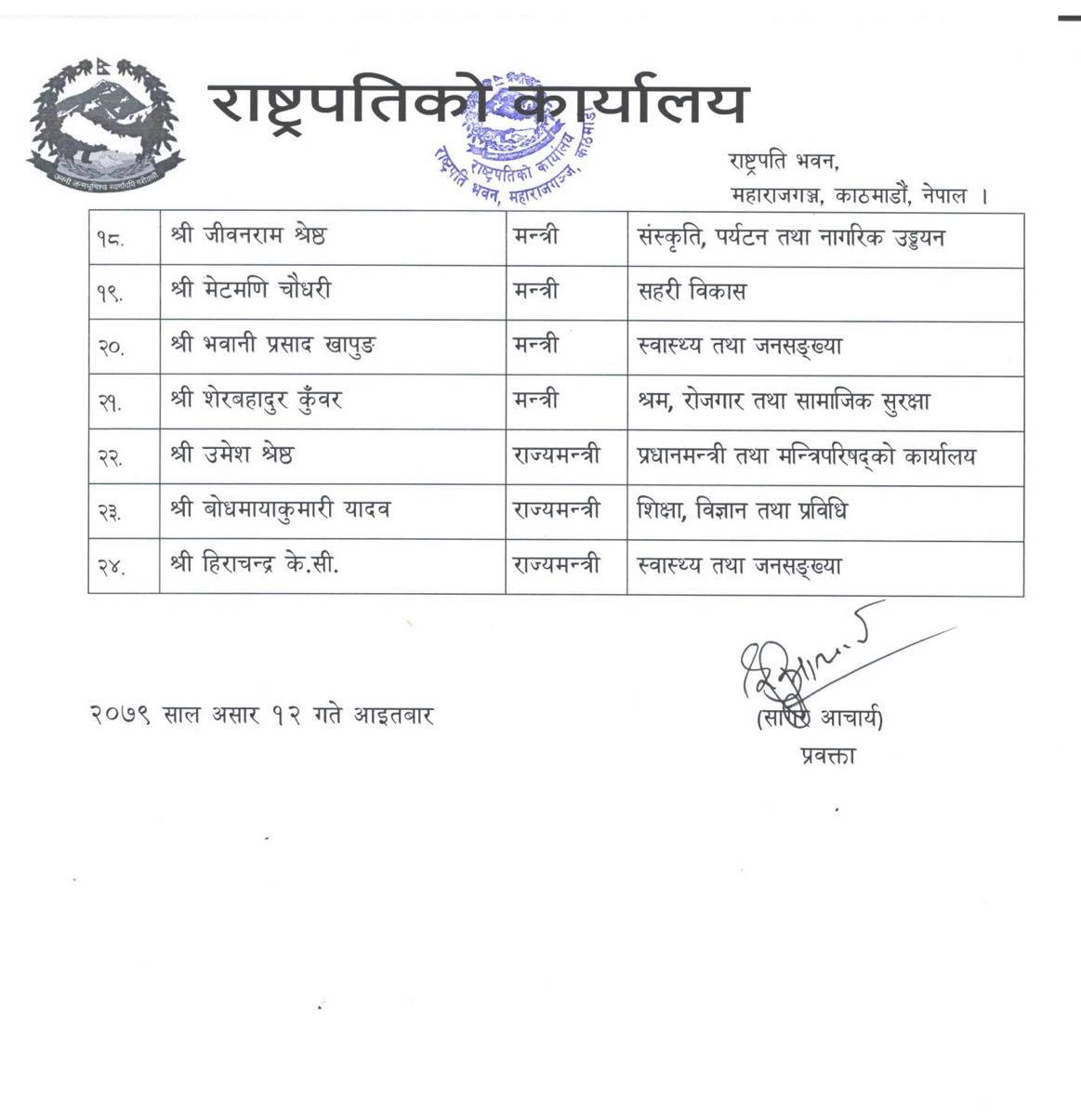 जसमा जीवनराम श्रेष्ठ पर्यटन, मेटमणी चौधरी सहरी विकास, भवानी खापुङ स्वास्थ्य तथा जनसंख्या र शेरवहादुर कुँवर श्रममन्त्री नियुक्त भएका छन् । त्यस्तै हिराचन्द्र केसी स्वास्थ्य राज्यमन्त्री नियुक्त भएका छन् । थपिएका नेकपा एसका सबै मन्त्रीहरुको वरियता सबैन्दा तल छ ।