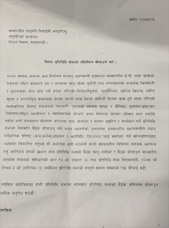 पत्रमा मंगलबार जारी अध्यादेशबारे छलफल गर्न जरुरी भएकाले संसद् अधिवेशन बोलाउन माग गरिएको छ ।