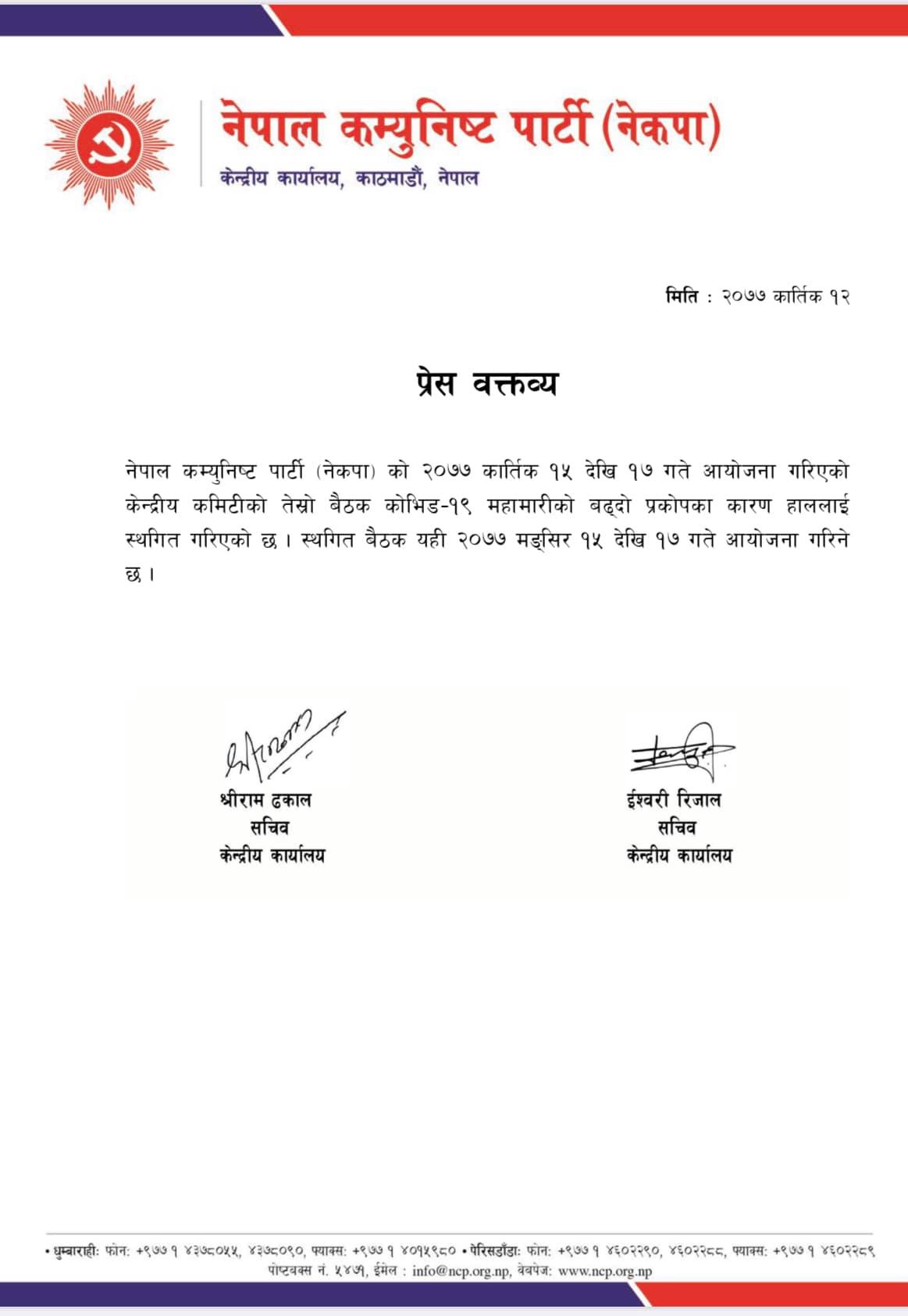 काेराेना भाइरस कोभिड-१९ को बढ्दो प्रकोपलाई ध्यानमा राख्दै बैठक एक महिनापछि सारिएको केन्द्रीय कार्यालयका सचिव ईश्वरी रिजाल र श्रीराम ढकालको विज्ञप्तिमा उल्लेख छ।