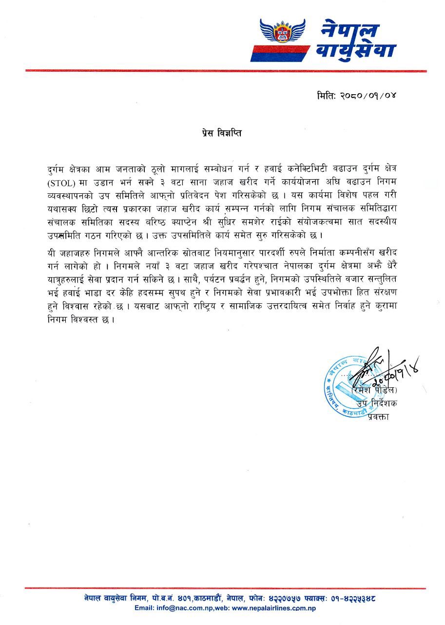 निगमका प्रवक्ता रमेश पौडेलका अनुसार दुर्गम क्षेत्रका आम जनताको ठूलो मागलाई सम्वोधन गर्न र हवाई कनेक्टिभिटी वढाउन दुर्गम क्षेत्रमा उडान भर्न सक्ने ३ वटा साना जहाज खरीद गर्ने कार्ययोजना अघि वढाउन निगम व्यवस्थापनको उप समिति गठन गरेर प्रक्रिया सुरु भएको हो ।