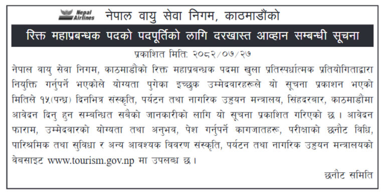 ‘नेपाल वायु सेवा निगम, काठमाडौंको रिक्त महाप्रबन्धक पदमा खुला प्रतिस्पर्धात्मक प्रतियोगिताद्वारा नियुक्ति गर्नुपर्ने भएकोले योग्यता पुगेका इच्छुक उम्मेदवारहरूले यो सूचना प्रकाशन भएको मितिले १५९पन्ध्र० दिनभित्र संस्कृति, पर्यटन तथा नागरिक उड्डयन मन्त्रालय, सिंहदरबार, काठमाडौंमा आवेदन दिनु हुन सम्बन्धित सबैको जानकारीको लागि यो सूचना प्रकाशित गरिएको छ,’ सूचनामा लेखिएको छ ।