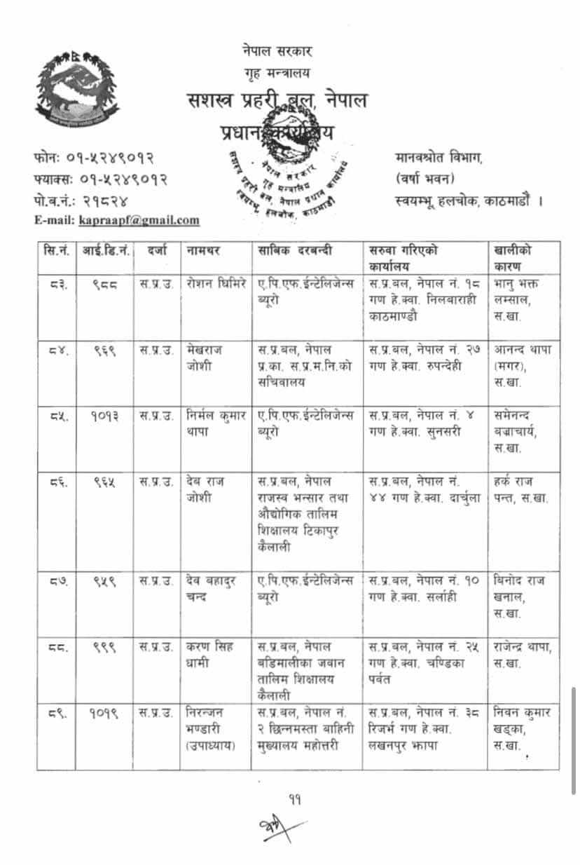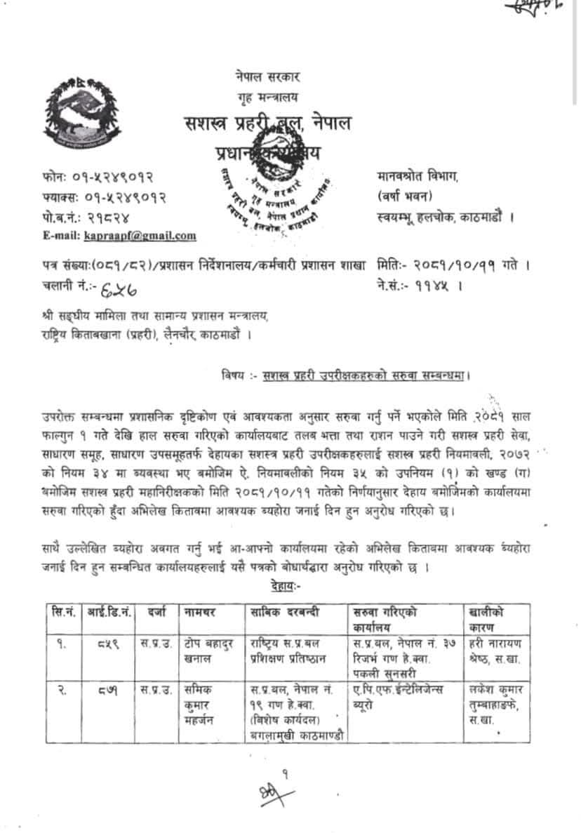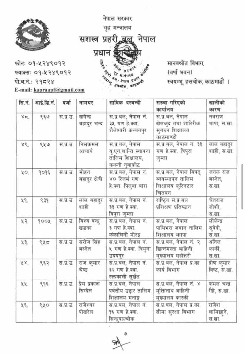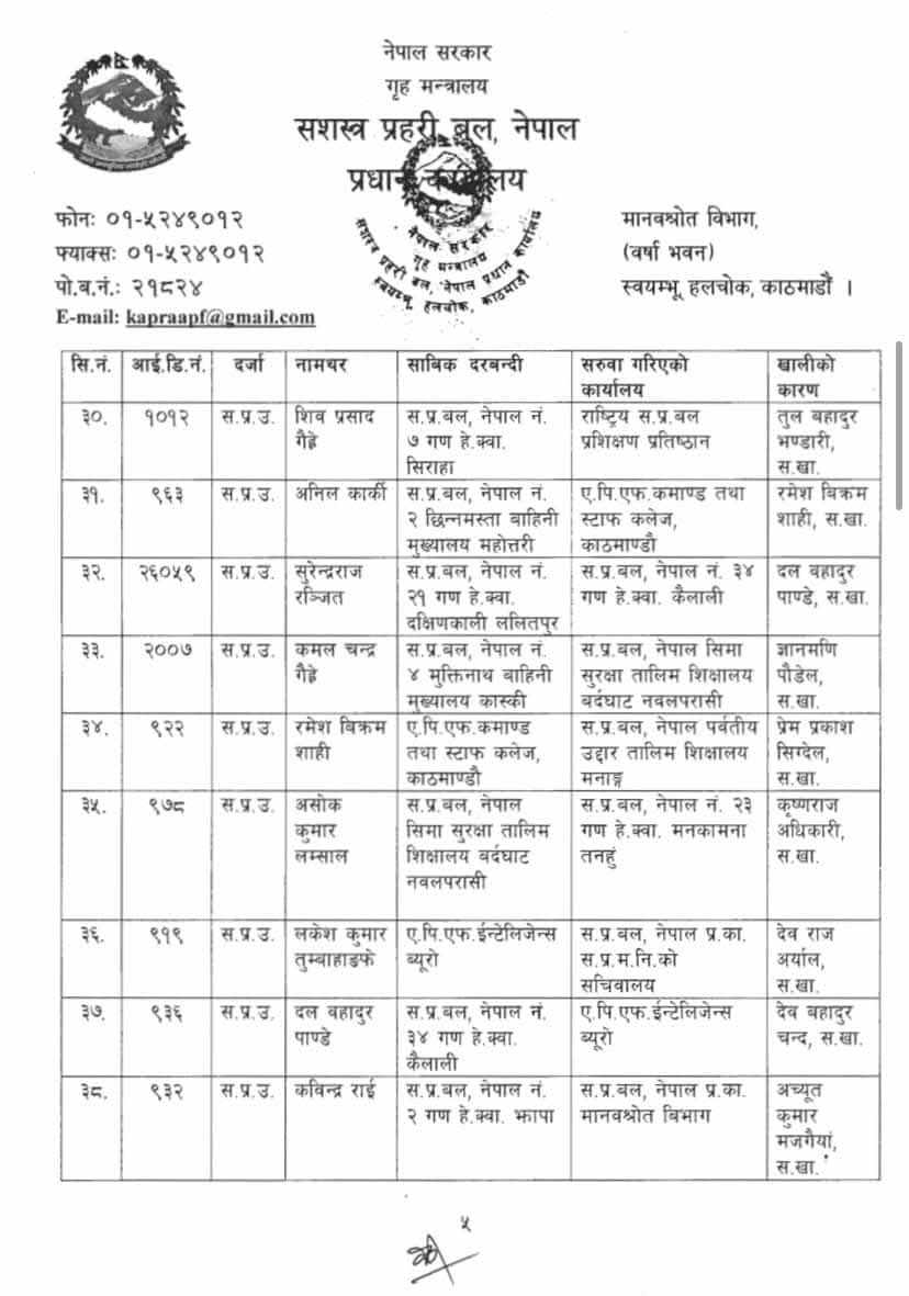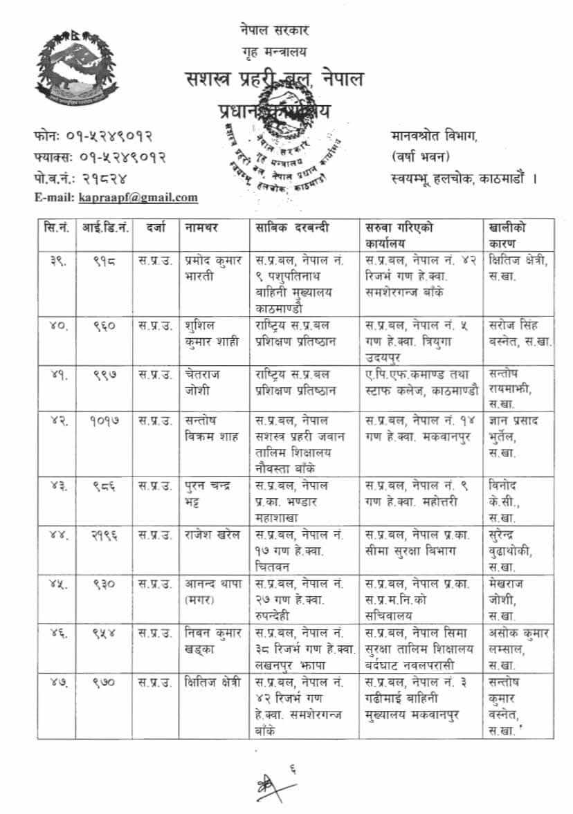 सरुवा भएकाहरू सशस्त्र प्रहरी सेवा, साधारण समूह, साधारण उपसमूहतर्फका छन् ।