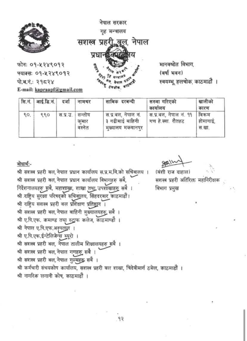 सशस्त्र प्रहरी महानिरीक्षको निर्णय अनुसार ९० एसपीहरूको सरुवा गरिएको हो । उनीहरूको प्रशासनिक दृष्टिकोण एवं आवश्यकताअनुसार सरुवा गरिएको जनाइएको छ ।