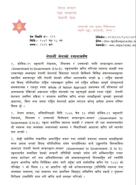 ‘तत्कालिन अन्तर्राष्ट्रिय बजार तथा स्वदेशी बजारमा स्वास्थ्य सामग्रीहरुको चरम अभाव भएको बिषम परिस्थितिमा समेत पारदर्शीताका साथै उच्चस्तरीय मितव्ययिता अपनाउन नेपाली सेनाले जीटुजी प्रकृयामार्फत सम्बन्धित देशको सरकारी प्रतिनिधी मात्रको प्रयोग गरी कमिशनरहित रुपमा प्रत्यक्ष कारोवार गर्न तथा अनियमितताका सबै सम्भावनाहरुलाई निरुत्साहित गर्ने रणनीति अनुरुप आन्तरिक खरिद निर्देशिका समेत जारी गर्नुका साथै सार्वजनिक खरिद ऐन २०६३ को परिच्छेद २ को नियम १६ मा आधारित रही सबै सरोकारवालाहरु (प्रतिनिधि स्वास्थ्य तथा जनसंख्या मन्त्रालय, रक्षा मन्त्रालय तथा आमन्त्रित विज्ञहरु) सम्मिलित खरिद इकाई र गुणस्तर निरीक्षण उपसमिति गठन गरी खरिद कार्य सम्पन्न गरिएको हो,’ विज्ञप्तिमा भनिएको छ ।