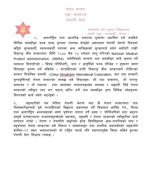 ‘विषम परिस्थिती, माग र आपूर्तिको फरक परिवेश र गुणस्तर जस्ता विषयहरु तुलना गर्न सकिदैन । पारदर्शिताको लागि मित्रराष्ट्र चीन सरकारबाटै तोकिएको सरकार नियन्त्रित कम्पनी (China Sinopharm International Corporation) बाट प्राप्त सरकारी मूल्यसूचिलाई नेपाल सरकारका सम्बद्ध सबै निकायहरुसँग समन्वय र सहमती लिई नेपाल सरकारको स्वीकृत प्राप्त भए पश्चात् खरिद गरी प्राप्त सामग्रीहरु हाल विभिन्न प्रदेशहरुमा वितरणको कार्य समेत भइरहेको छ,’ सेनाले भनेको छ ।