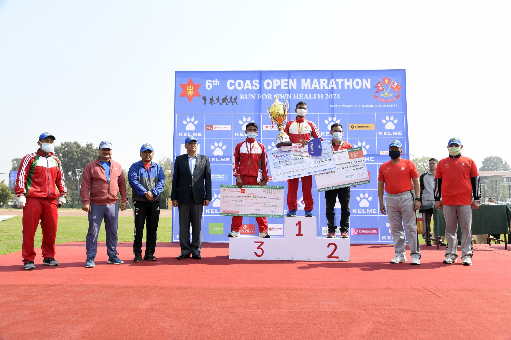 ‘महाशिवरात्रि तथा सेना दिवस २०७७’ को उपलक्ष्यमा छैठौं प्रधान सेनापति म्याराथन को पुरुष तर्फ ४२.१९५ किमि म्याराथन दौडमा जमदार बस्नेत र महिला तर्फको २१ किमि हाफ म्याराथनको उपाधिमा भण्डारी प्रथम भएको सेनाले जनाएको छ ।