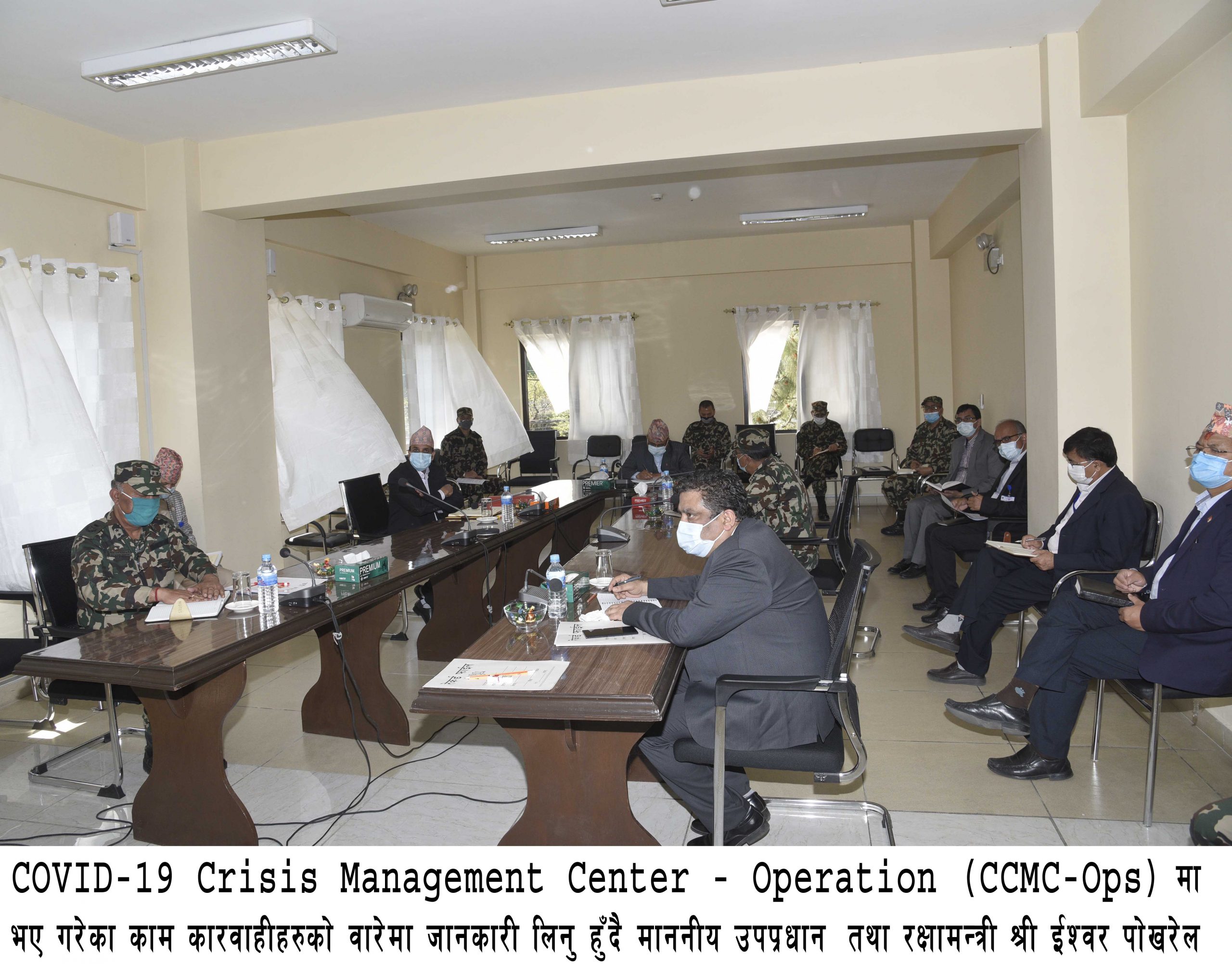 काठमाडौं – उपप्रधानमन्त्री तथा रक्षामन्त्री ईश्वर पोखरेलले कोरोना भाइरस रोकथाम, नियन्त्रण र प्रतिकार्यको लागि छाउनीमा स्थापित सङ्कट व्यवस्थान केन्द्र (सिसिएमसी) सञ्चालनस्थलको आज अवलोकन गरी सोको कार्य प्रगतिबारे जानकारी लिएका छन् ।