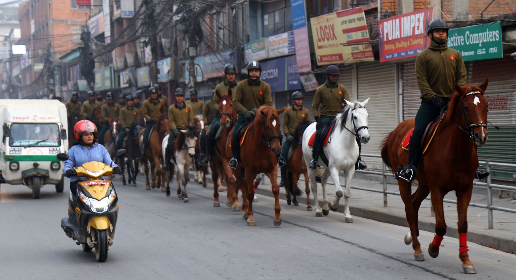 काठमाडौंको पुतली सडक हुँदै बिहीबार बिहान नेपाली सेनाका घोडचडी जवान सिंहदरबारतर्फ जाँदै । तस्वीर : प्रदीपराज वन्त/रासस