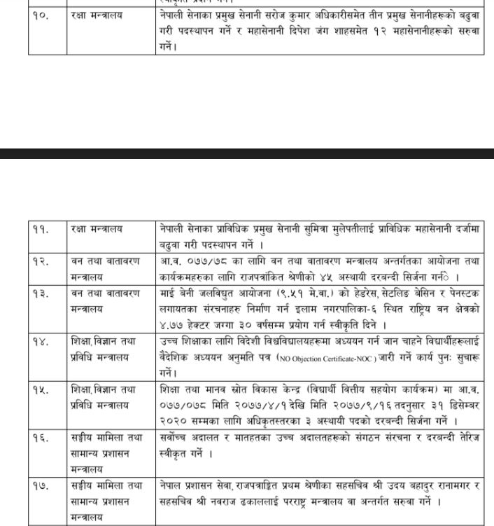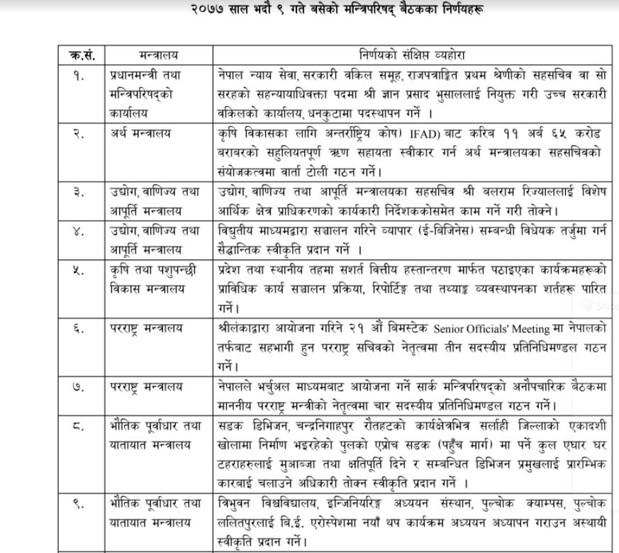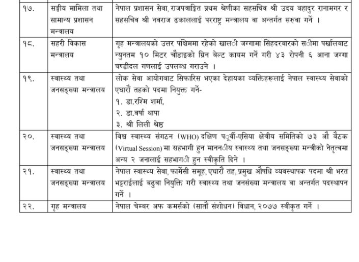 त्यस्तै बैठकले सहन्यायाधिवक्तामा ज्ञान प्रसाद भुसाललाई नियुक्त गरी सरकारी वकिलको कार्यालय धनकुटामा पदस्थापन गर्ने निर्णय छ भने वाणिज्य तथा आपूर्ति मन्त्रालयका सहसचिव बलराम रिजाललाई विशेष आर्थिक क्षेत्र प्राधिकरणको कार्यकारी निर्देशकको जिम्मेवारी दिइएको छ ।