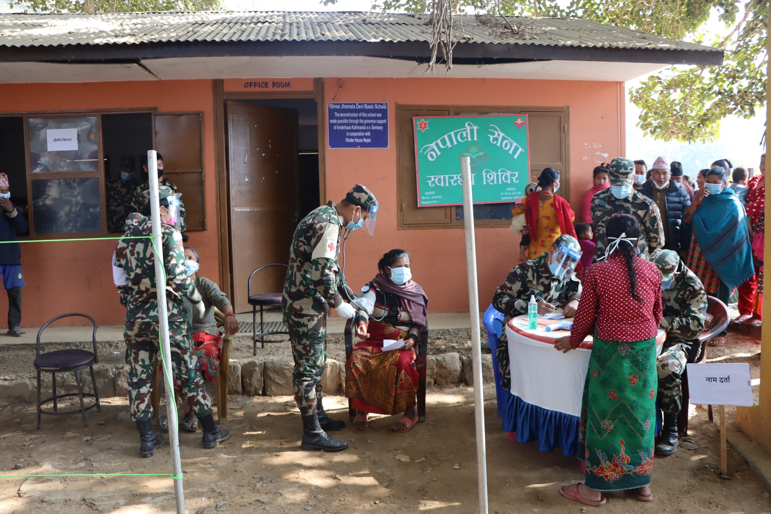 सैनिक श्रीमति संघ (नेपाली सेना) ले राहत सामाग्री बितरण एवं श्री नं. २६ बाहिनी अड्डा तथा श्री गोरख बक्स गणको पहलमा एकदिने निःशुल्क स्वास्थ्य शिविर सञ्चालन गरिएको हो ।
