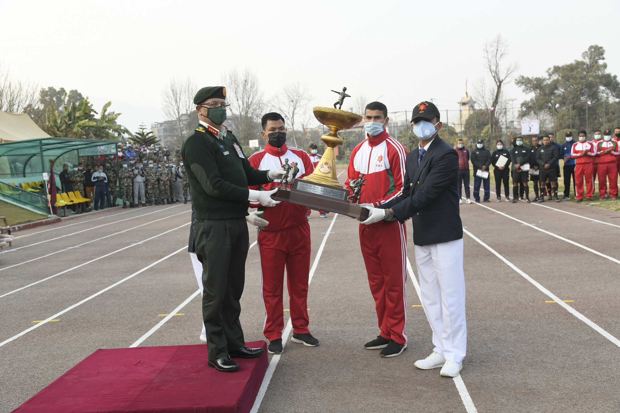 पुस २१ गतेबाट सुरु भएको उक्त ट्रफि प्रतियोगिता आज जङ्गी अड्डास्थित खेल मैदानमा प्रधानसेनापति थापाले एक विशेष समारोहकाबीच समापन गरेका हुन् । यस प्रतियोगितामा फुटबल, भलिबल, बास्केटबल, शुटीङ्ग र एथलेटीक्स गरी ५ वटा विधा समावेश गरिएको थियो भने आर्चेरीलाई पहिलो पटक डेमोन्सट्रेशन खेलको रुपमा समावेश गरिएको थियो ।