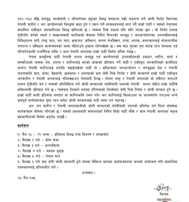 सोमबार महासचिव विप्लवद्वारा हस्ताक्षरित विज्ञप्तिमा सो पार्टीले नेपाल बन्दसहितका संघर्षका कार्यक्रमहरु घोषणा गरेको हो ।