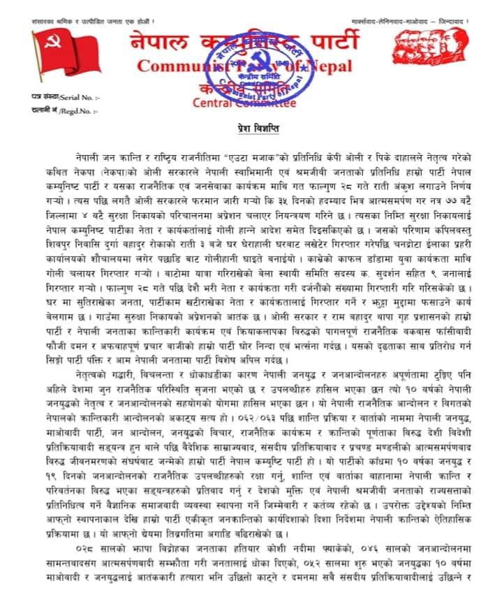 महासचिव विप्लवले जारी गरेको प्रेस विज्ञप्तिमा ओली र पिके दाहालले नेतृत्व गरेको कथित नेकपा (नेकपा)को ओली सरकारले नेपाली स्वाभिमानी एवं श्रमजीवी जनताको प्रतिनिधि नेपाल कम्युनिष्ट पार्टी र यसका राजनैतिक एवं जनसेवाका कार्यक्रममाथि गत फागुन २८ गते राती अंकुश लगाउने काम भएको जनाइएको छ ।