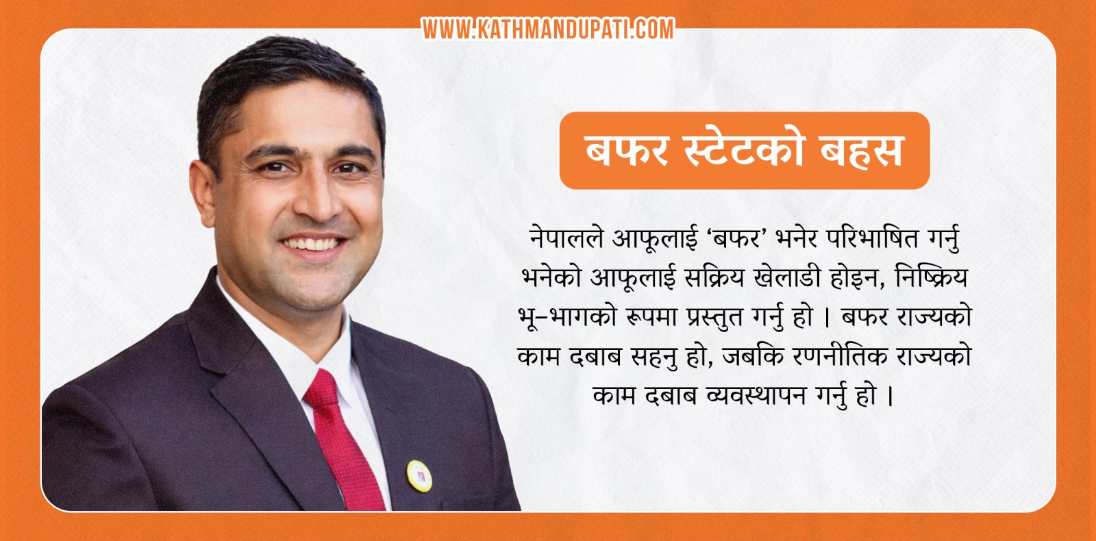 नयाँ सरकारले सार्वजनिक गरेको १०० दिने प्राथमिकतामा एउटा उल्लेखनीय कुरा देखियो–नेपाललाई ‘बफर स्टेट’ अर्थात् मध्यवर्ती राज्यको रूपमा विगतमा परिभाषित गरिएको स्विकारोक्ति । तत्पश्चात सामाजिक सञ्जाल, चिया पसलदेखि नीति वृत्तसम्म यसको समर्थन र विरोधमा बहस तातेको छ । कसैले यसलाई ऐतिहासिक यथार्थको स्वीकारोक्ति भनेका छन्, कसैले राष्ट्रिय आत्मसम्मानमाथि प्रश्न उठाएका छन् ।