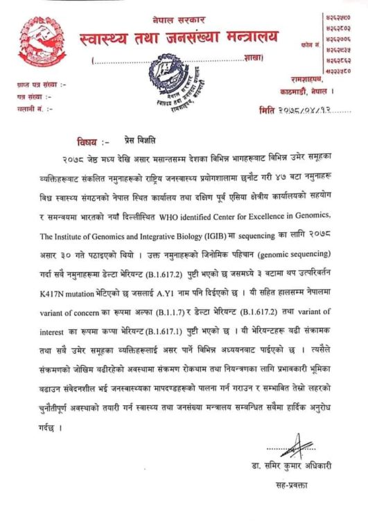नयाँ भेटिएका भेरिएन्ट र म्युटेन्टहरु बढी संक्रामक रहेको भन्दै मन्त्रालयले जनस्वास्थयका मापदण्ड अपनाउन अनुरोध समेत गरेको छ । मन्त्रालयका सह प्रवक्ता समीर अधिकारीले यो भेरियन्ट सबै उमेर समूहका व्यक्तिलाई असर पार्ने देखिएकाले तेस्रो लहरको चुनौतीपूर्ण अवस्थाको सामना गर्न तयारी अवस्थामा रहन आग्रह गरेका छन् ।