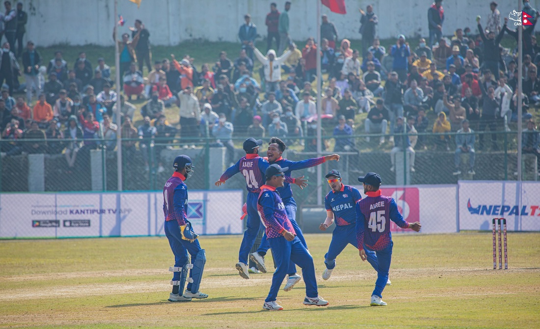 नेपालले शुरूआतदेखि नै विकट गुमाउँदै गयो । नेपालका लागि सन्दीप लामिछानेले ४२, रोहित पौडेलले २७, आसिफ शेखले १९, दीपेन्द्रसिंह ऐरीले १२, सोमपाल कामी र आरिफ शेखले ११(११, गुल्सन झाले सात, भीम सार्कीले ६, कुशल मल्लले तीन, कुशल भुर्तेलले दुई र ललित राजवंशीले एक रन बनाए।