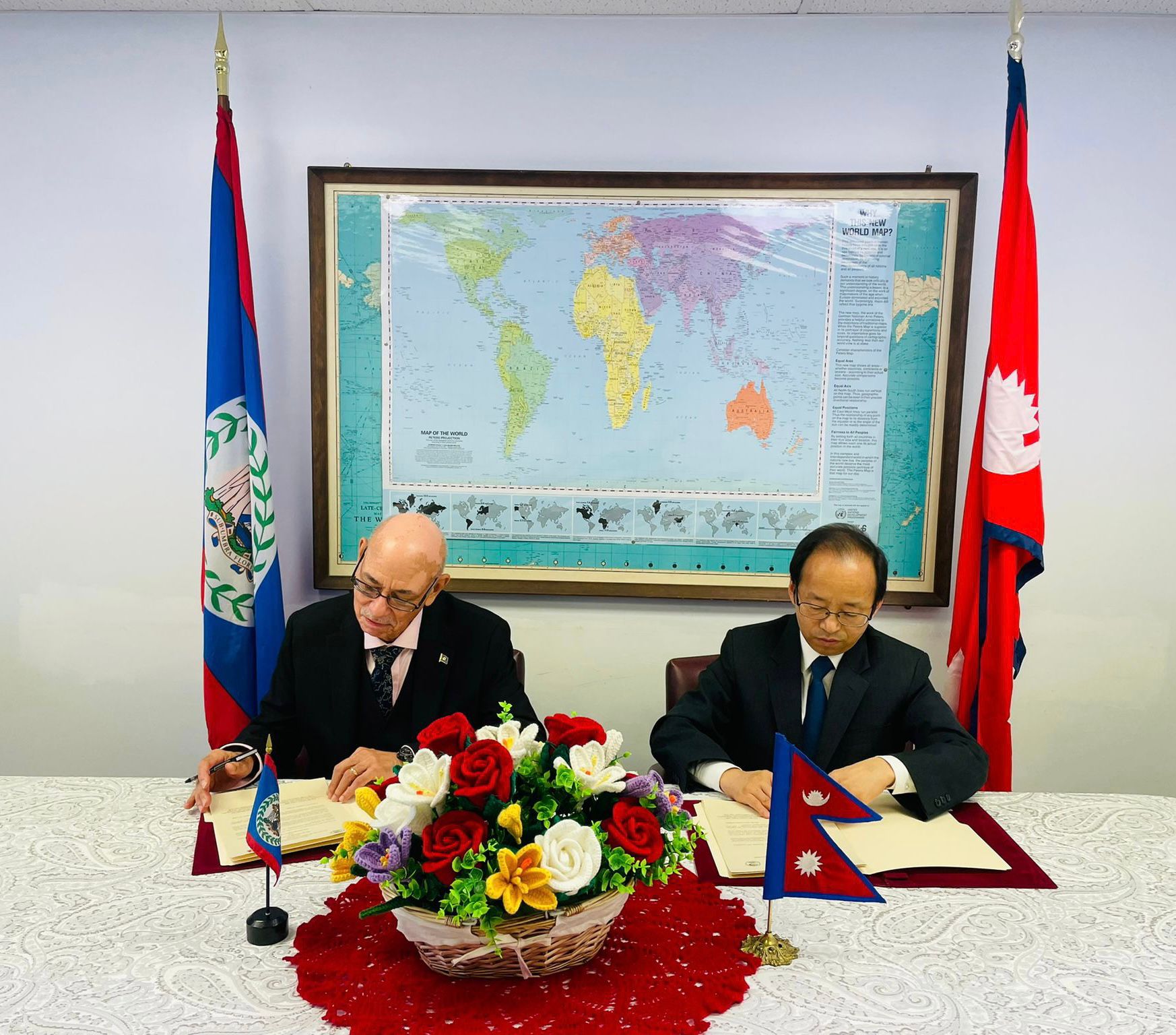 कूटनीतिक स्थापना गर्ने सम्बन्धी पत्रमा नेपालको तर्फबाट न्युयोर्कस्थित राष्ट्रसंघीय स्थायी नियोगका लागि स्थायी प्रतिनिधि तथा राजदूत अमृतबहादुर राई र बेलिजको तर्फबाट राष्ट्रसंघका लागि बेलिजका स्थायी प्रतिनिधि तथा राजदूत कार्लोस सी. फुलरले हस्ताक्षर गरेका थिए ।