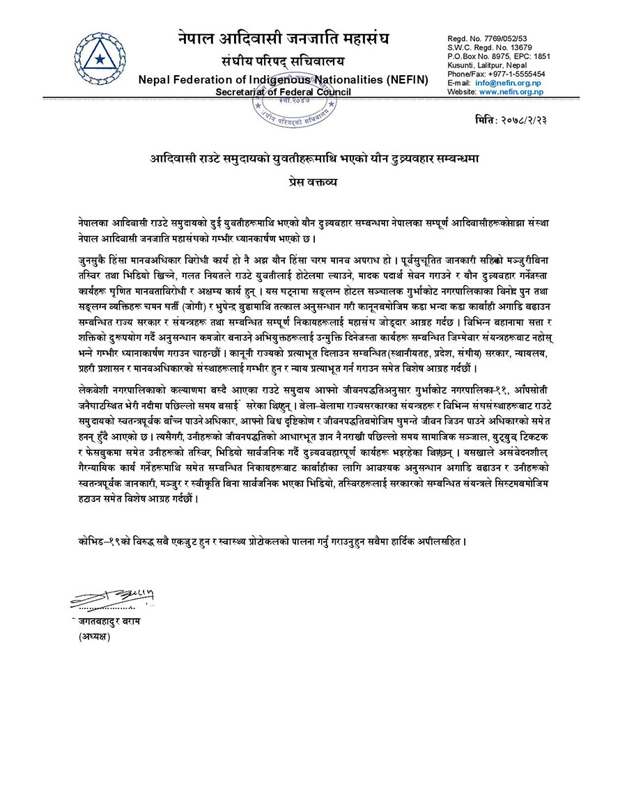 काठमाण्डु – आदिवासी जनजाति महासंघले राउटे समुदायका युवतीमाथि भएको दुर्व्यवहारप्रति आपत्ति जनाएको छ । महासंघका अध्यक्ष जगत बरामले एक विज्ञप्ति जारी गर्दै सो घटनाप्रति आपत्ति जनाएका हुन् ।