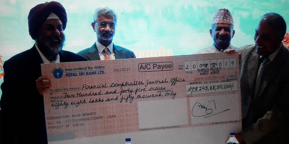 भारतका बाह्य मामिलामन्त्री सुब्रमन्यम जयशङ्कर र परराष्ट्रमन्त्री प्रदीपकुमार ज्ञवालीको उपस्थितिमा पुनः निर्माण प्राधिकरणका प्रमुख कार्यकारी अधिकृत सुशील ज्ञवालीलाई नेपालका लागि भारतका राजदूत मञ्जिवसिंह पुरीले उक्त रकमको चेक हस्तान्तरण गरेका हुन्।