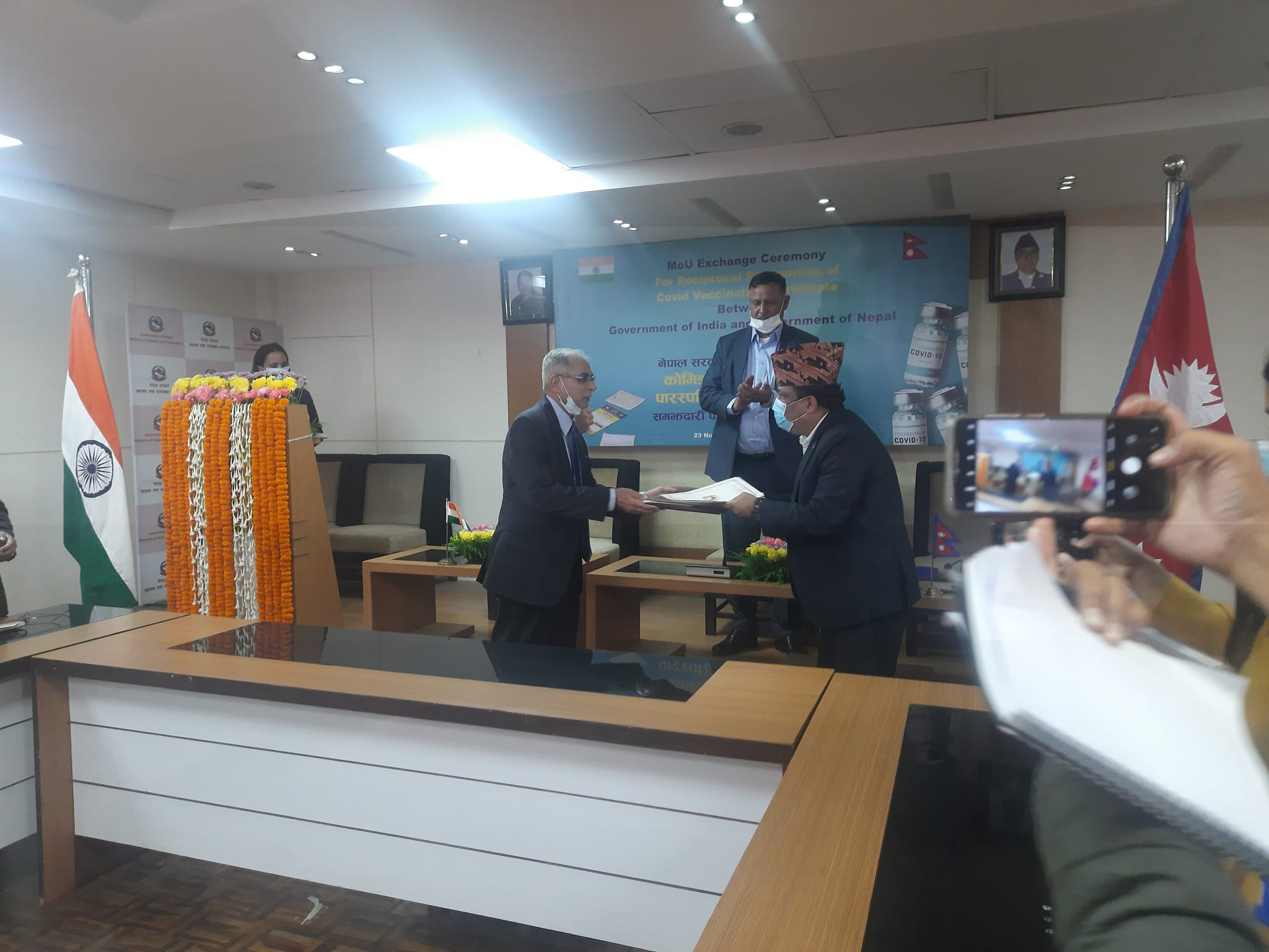 काठमाण्डु – नेपाल र भारतबीच कोरोना भाइरस विरुद्धको खोप प्रमाणपत्रको पारस्परिक मान्यता दिनेबारेमा सहमति भएको छ । आज स्वाथ्य मन्त्रालयमा भएको कार्यक्रममा दुई देशका प्रतिनिधिबिच सहमति पत्रमा हस्ताक्षर भएको हो ।