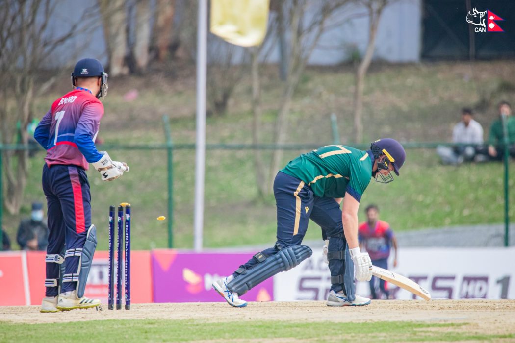 नेपालका साहब आलम र रिजन ढकालले तीन–तीन विकेट लिए । १० ओभर बलिङ गरेका आलमले एक मेडन राख्दै ३५ रन खर्चिए । मौसम ढकालले दुई विकेट लिदा कमलसिंह ऐरीको नाममा समान एक विकेट रह्यो।