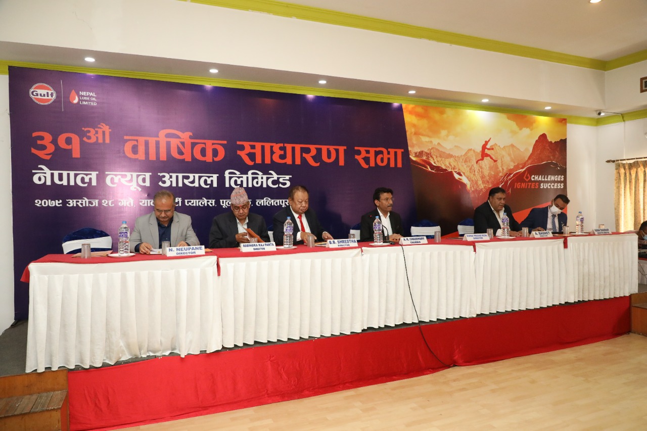 बैठकलाई सम्बोधन गर्दै अध्यक्ष अरुण कुमार चौधरीले भने, “ नेपाल ल्युब आयल लिमिटेडले अघिल्लो वर्ष जस्तै यस कठिन आर्थिक अवस्थामा पनि निरन्तर वृद्धि कायम राखेको छ । व्यवस्थापन र अन्य टोली सदस्यहरू यस कम्पनीको विकासको लागि राम्रोसँग प्रतिबद्ध छन्। शेयरधनीहरूले देखाएको विश्वासलाई हामी कहिल्यै निराश गर्नेछैनौं ।