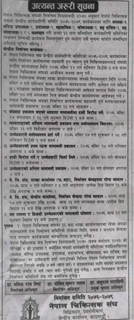काठमाडौं– नेपाल चिकित्सक संघले निर्वाचन तालिका सार्वजनिक गरेको छ । आगामी माघमा हुने संघको निर्वाचनमा उपत्यकाबाहिर २ दिन र उपत्यकाभित्र ५ दिन मतदान हुनेछ ।