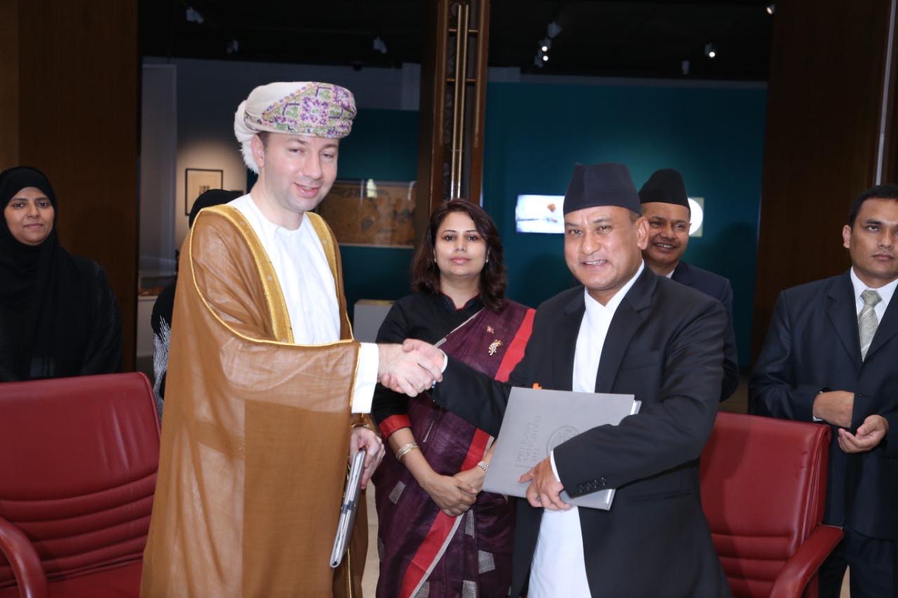 गत सोमबार ओमानको राष्ट्रिय संग्राहलयमा आयोजित कार्यक्रममा समझदारी पत्रमा नेपालको तर्फबाट राष्ट्रिय संग्राहलय छाउनीका कार्यालय प्रमुख जयराम श्रेष्ठ तथा ओमानको तर्फबाट राष्ट्रिय संग्राहलय ओमानका महानिर्देशक जमल बिन हसन अल मोवासीले हस्ताक्षर गरेका छन् ।