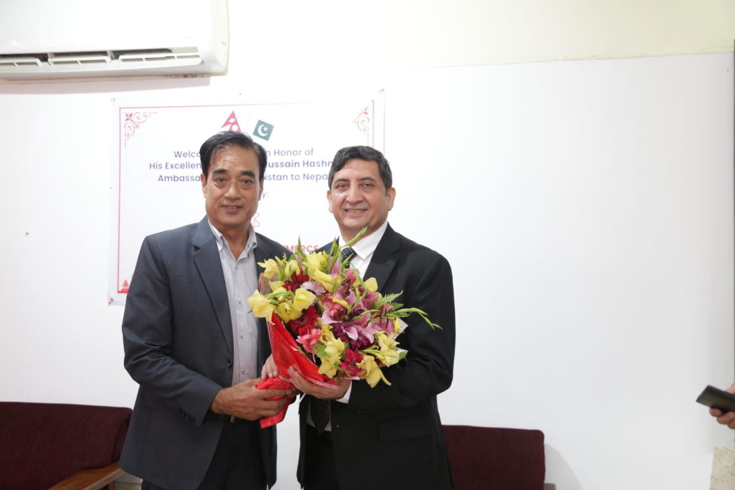 नेपालका लागि नवनियुक्त पाकिस्तानी राजदुत हास्मीलाई काठमाडौंको जमलस्थित चेम्बर भवनमा आज स्वागत गर्दै अध्यक्ष राजेन्द्र मल्लले दुई मुलुकबीचको व्यापार वृद्धि, पर्यटन आदान प्रदान एवं अन्य आर्थिक, व्यापारिक गतिविधी विस्तारका लागि तत्काल हवाई सेवा सञ्चालनमा ल्याउनुपर्नेमा जोड दिए ।