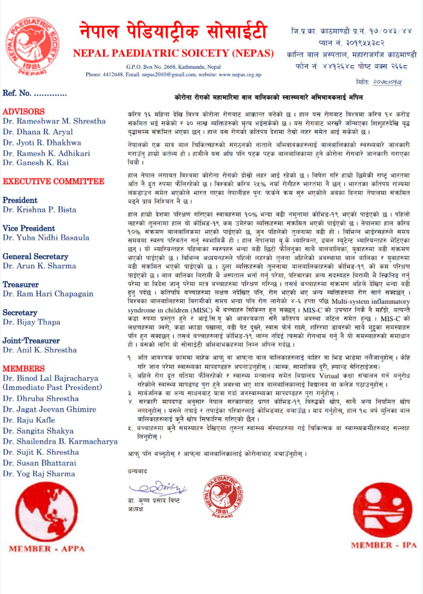 काठमाण्डु – पछिल्लो समय नेपालमा कोरोना भाइरसको संक्रमण बालबालिकामा बढ्न थालेपछि बाल रोग विशेषज्ञ चिकित्सकहरुको संगठन नेपाल पेडियाट्रिक सोसाइटीले अभिभावकहरुलाई ५ बुँदे अपील जारी गरेको छ ।
