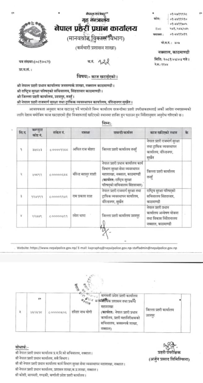 काठमाण्डु-प्रहरी प्रधान कार्यालयले चारजना प्रहरी उपरीक्षक (एसपी)को काज सरुवा गरेको छ । जिल्ला प्रहरी कार्यालय उदयपुरमा हरिहरनाथ योगी र तनहुँमा वीरेन्द्र बहादुर शाहीलाई पठाइएको छ ।