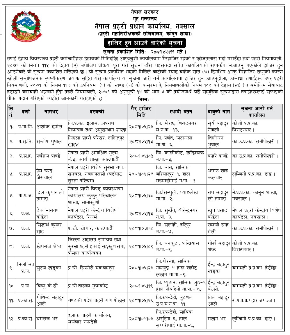 सम्पर्कविहीन १२ जना प्रहरीलाई हाजिर हुन आग्रह (नामसहित)