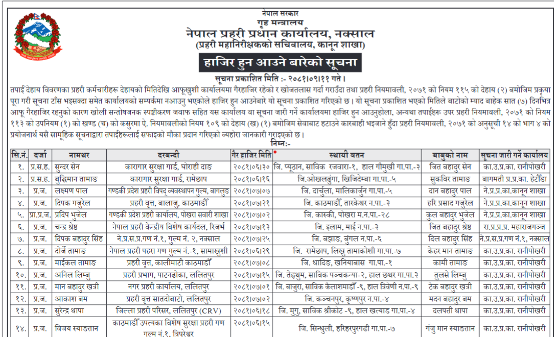 समयमै हाजिर भए उनीहरूलाई सफाइको मौका दिइने अन्यथा प्रहरी नियमावली २०७१ को नियम ११३ को उपनियम १ को खण्ड (च) को कसुरअनुसार सेवाबाट हटाउने चेतावनी दिइएको छ ।