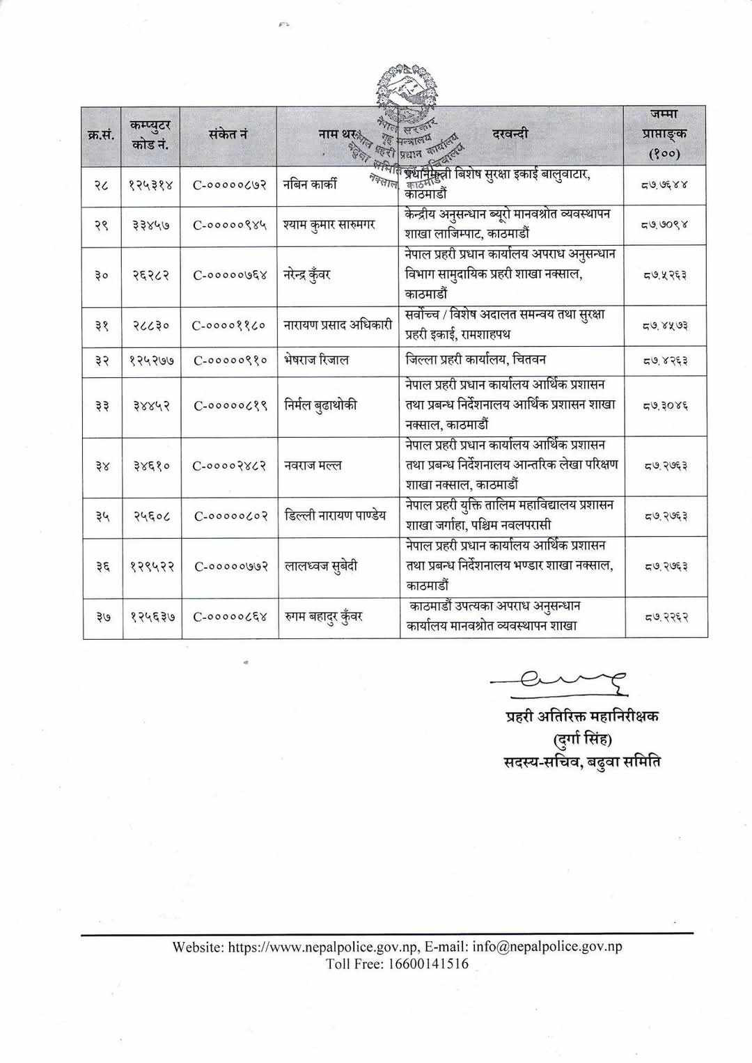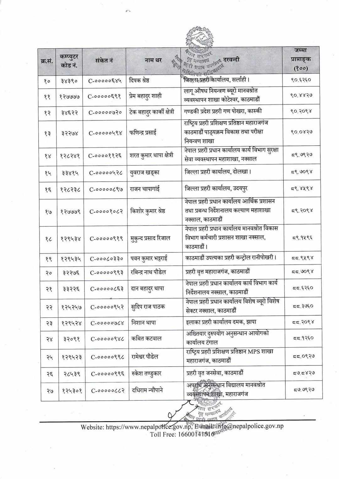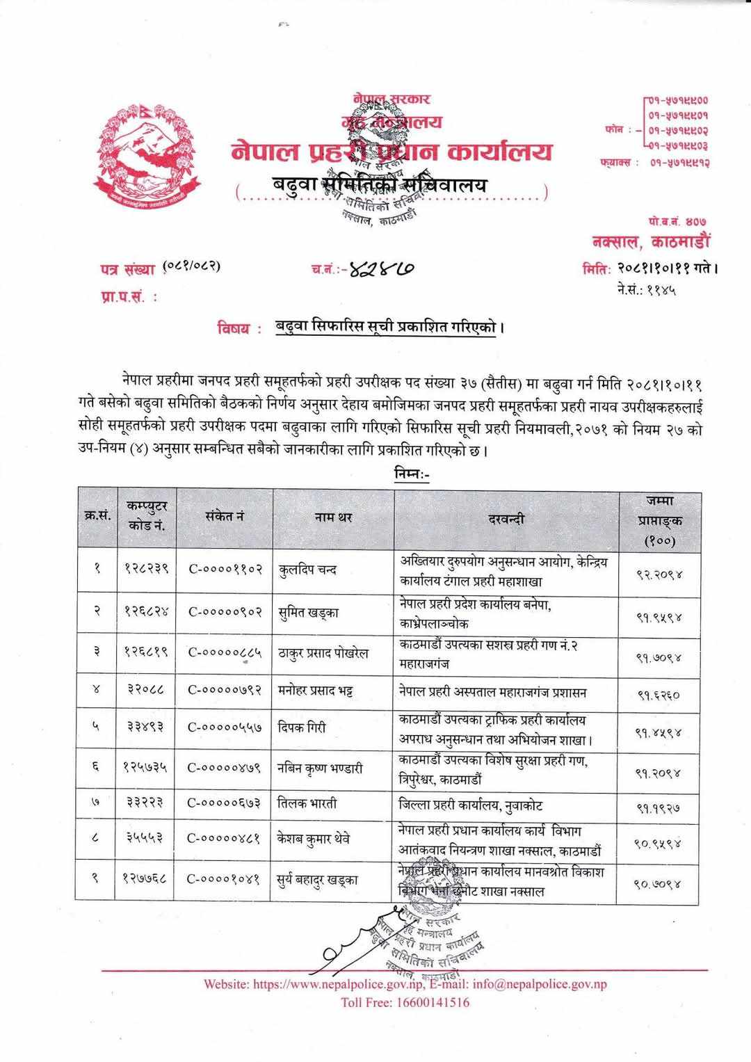 सिफारिस सूचीको पहिलो नम्बरमा डीएसपी कुलदीप चन्द छन् । यस्तै, सिफारिस हुनेमा सुमित खड्का, ठाकुर प्रसाद पोखरेल, मनोहर प्रसाद भट्ट, दिपक गिरी, नवीन कृष्ण भण्डारी, तिलक भारती, केशव कुमार थेवे, सूर्य खड्का, दीपक श्रेष्ठ, प्रेम बहादुर शाही, टेक बहादुर कार्की क्षेत्री, फणीन्द्र प्रसाईँ र शरत कुमार थापा क्षेत्री छन् ।