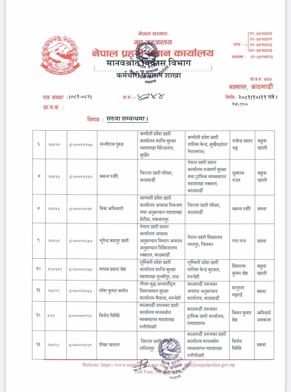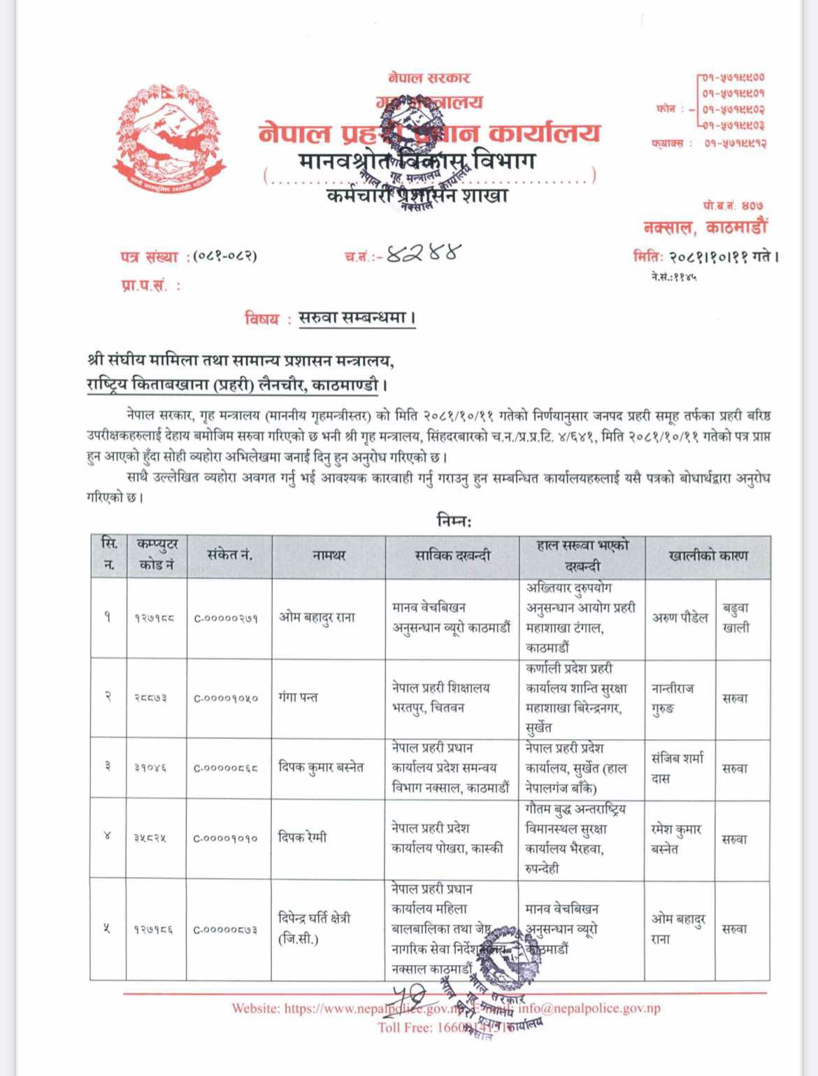 यसैगरी, अनुसन्धान कार्यालयका प्रमुख सानुराम भट्टराई अन्तर्राष्ट्रिय प्रहरी समन्वय महाशाखामा पठाइएका छन् ।