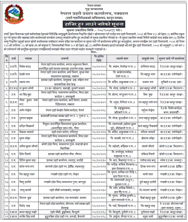 गैरहाजिर हुने २२ प्रहरीलाई सम्पर्कमा आउन आग्रह सूचनासहित
