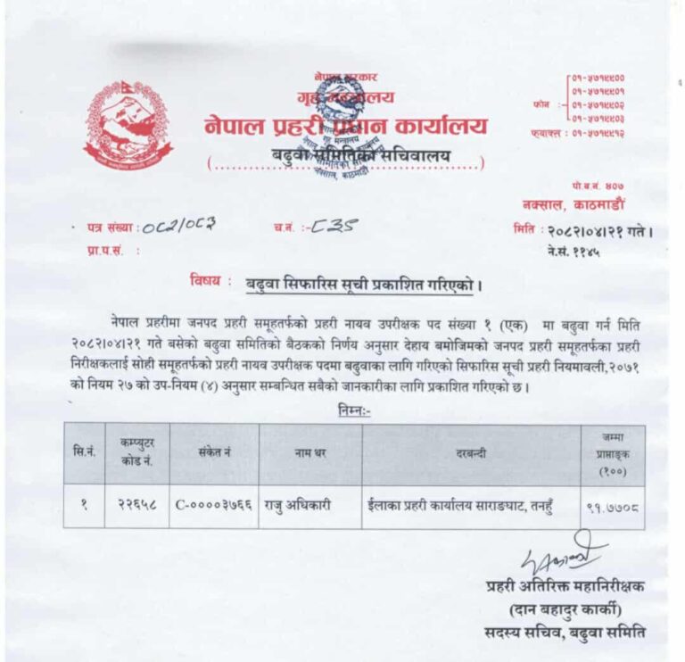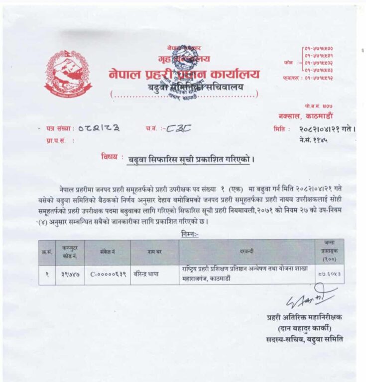 नेपाल प्रहरी प्रधान कार्यालय, बढुवा समितिले गरेको निर्णय अनुसार थापा एसपी बढुवा सिफारिस भएका हुन् । त्यस्तै डीएसपीमा रिक्त एक पदमा बढुवाका लागि इन्स्पेक्टर राजु अधिकारी सिफारिस भएका छन् ।