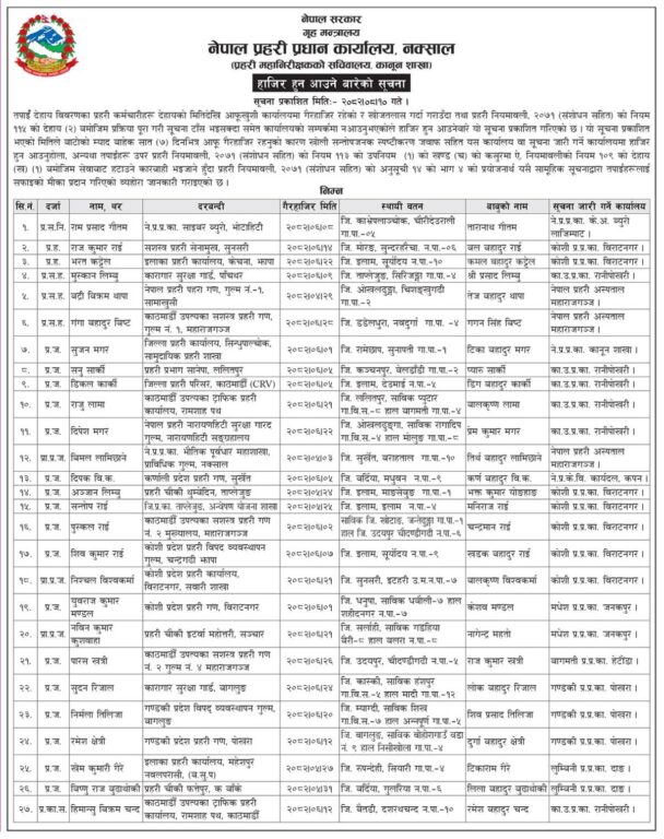 काठमाण्डु – नेपाल प्रहरीले गैरहाजिर रहेका २७ प्रहरी कर्मचारीलाई ७ दिनभित्र हाजिर हुन निर्देशन दिएको छ ।