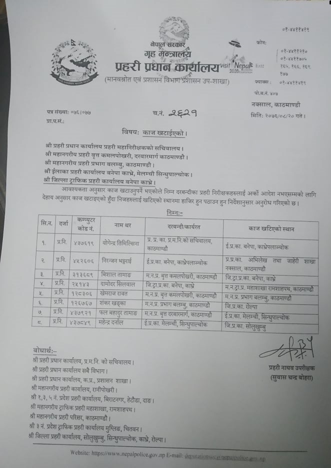 काठमाडौँ—नेपाल प्रहरीले ८ जना प्रहरी निरीक्षक (इन्सपेक्टर) को काज सरुवा गरेको छ।