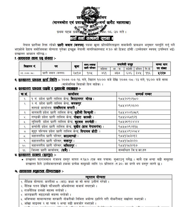 काठमाण्डु – नेपाल प्रहरीमा रिक्त रहेको प्रहरी जवान (जनपद)पदका लागि ५ हजार २ सय २७ जनाका लागि खुल्ला प्रतियोगिताद्वारा समावेशी प्रावधान अनुसार नयाँ भर्ना दरखास्त आव्हान गरिएको छ ।