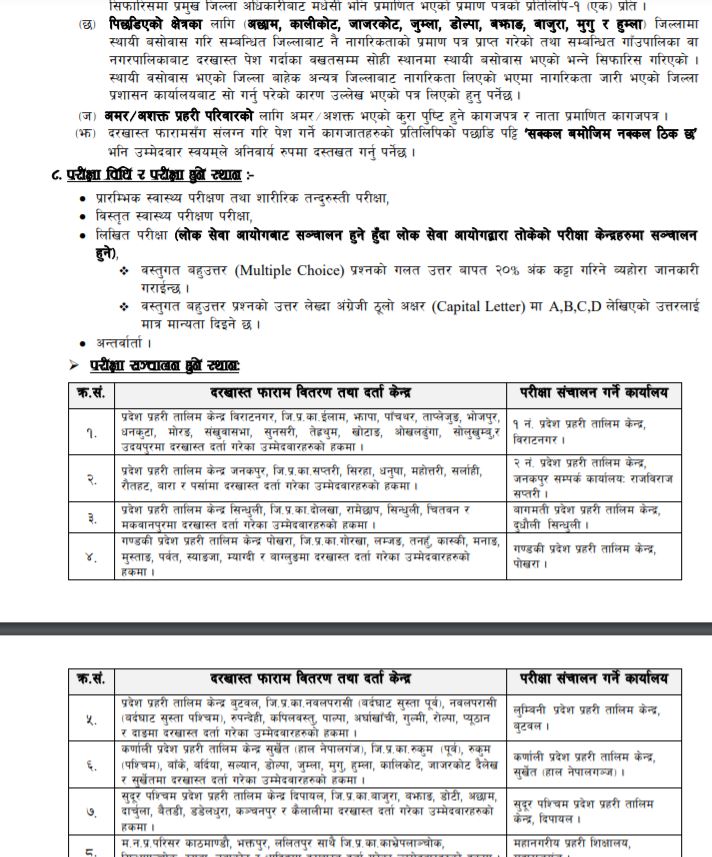 प्रहरी जवान पदका लागि महानगरीय प्रहरी परिसरहरु काठमाण्डु, भक्तपुर र ललितपुर, ७ वटै प्रदेश प्रहरी तालिम केन्द्रहरु विराटनगर, जनकपुर, दुधौली सिन्धुली, पोखरा, बुटवल, सुर्खेत(हाल नेपालगंज) र दिपायल तथा ७७ वटै जिल्ला प्रहरी कार्यालयहरुमा दरखास्त फारम पाइने र बुझाउन सकिने छ ।