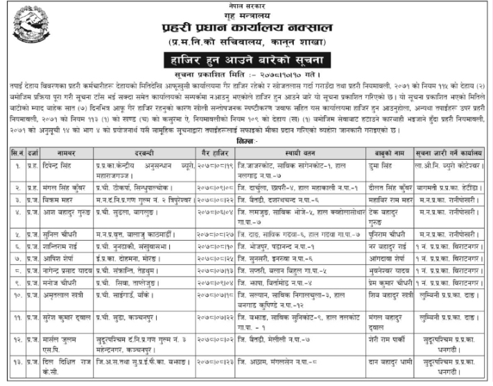 सम्पर्कमा नरहेका प्रहरी जवानहरु विक्रम महर, आशबहादुर गुरुङ, सुनिल चौधरी, शान्तिराम राई, आषिश शेर्पा, नागेन्द्रप्रसाद यादव, मनोज चौधरी, अमृतलाल खत्री, सुरेश कुमार द्वाल, मार्सल जुलम एसपी, दिल दीक्षित राज केसी हुन् । त्यस्तै हप्तादिन भित्रसम्पर्कमा नआए उनीहरुलाई सेवाबाट हटाउने समेत प्रहरी हेडक्वाटारले चेतावनी दिएको छ ।