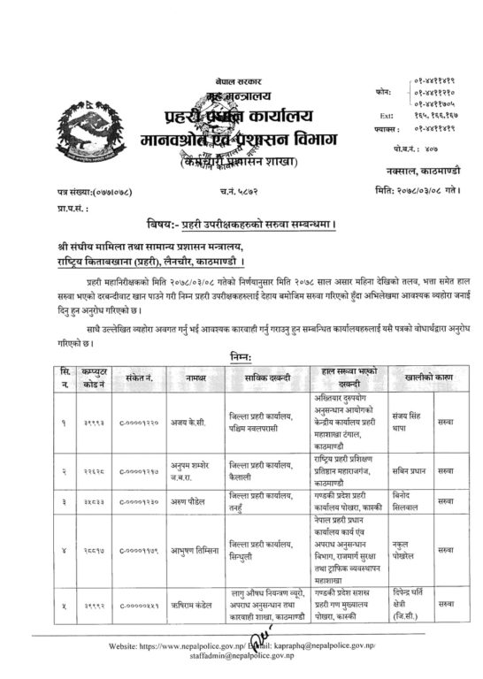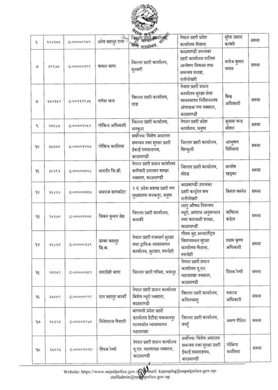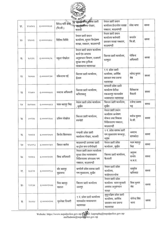 सरुवाको सूची अनुसार जिल्ला प्रहरी कार्यालय कास्कीमा रमेश थापा सरुवा भएका छन् । दानबहादुर कार्यालय कपिलवस्तु, श्यामकृष्ण अधिकारी बाँकेमा सरुवा भएका छन् । त्यस्तै कर्मचारी प्रशासनमा दिलिप घिमिरे सरुवा भएका छन ।